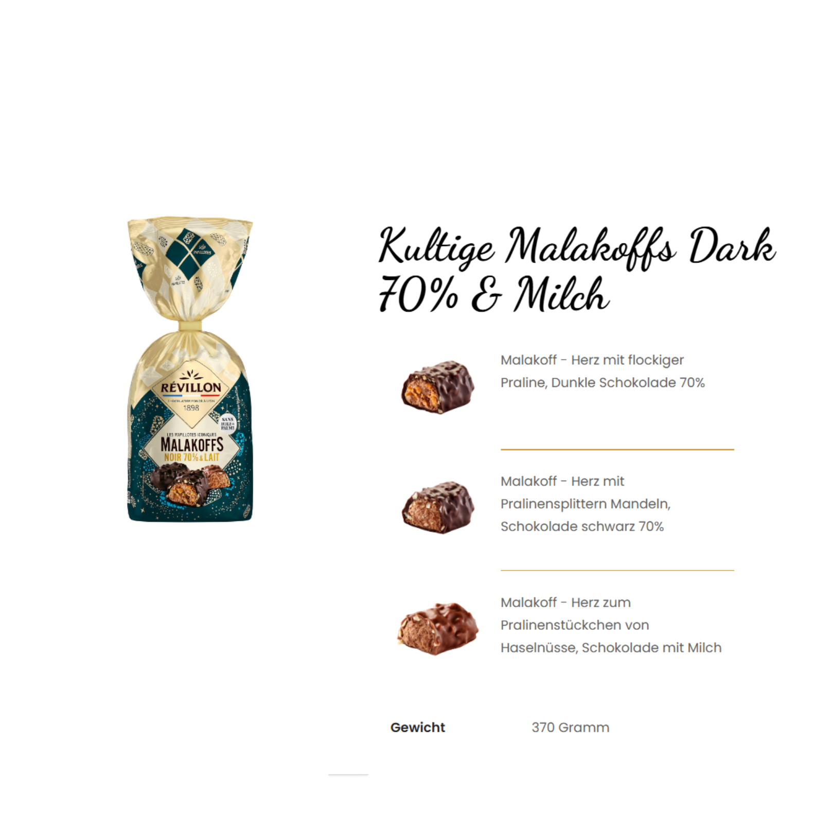 Die Papillotes Malakoff Dunkel und Milch von Revillon sind ein luxuriöses Schokoladenerlebnis, das sowohl Liebhaber von Zartbitter- als auch von Milchschokolade begeistert. Diese feinen Pralinen sind in einer ansprechenden Verpackung erhältlich und eignen sich hervorragend als Geschenk oder für besondere Anlässe.