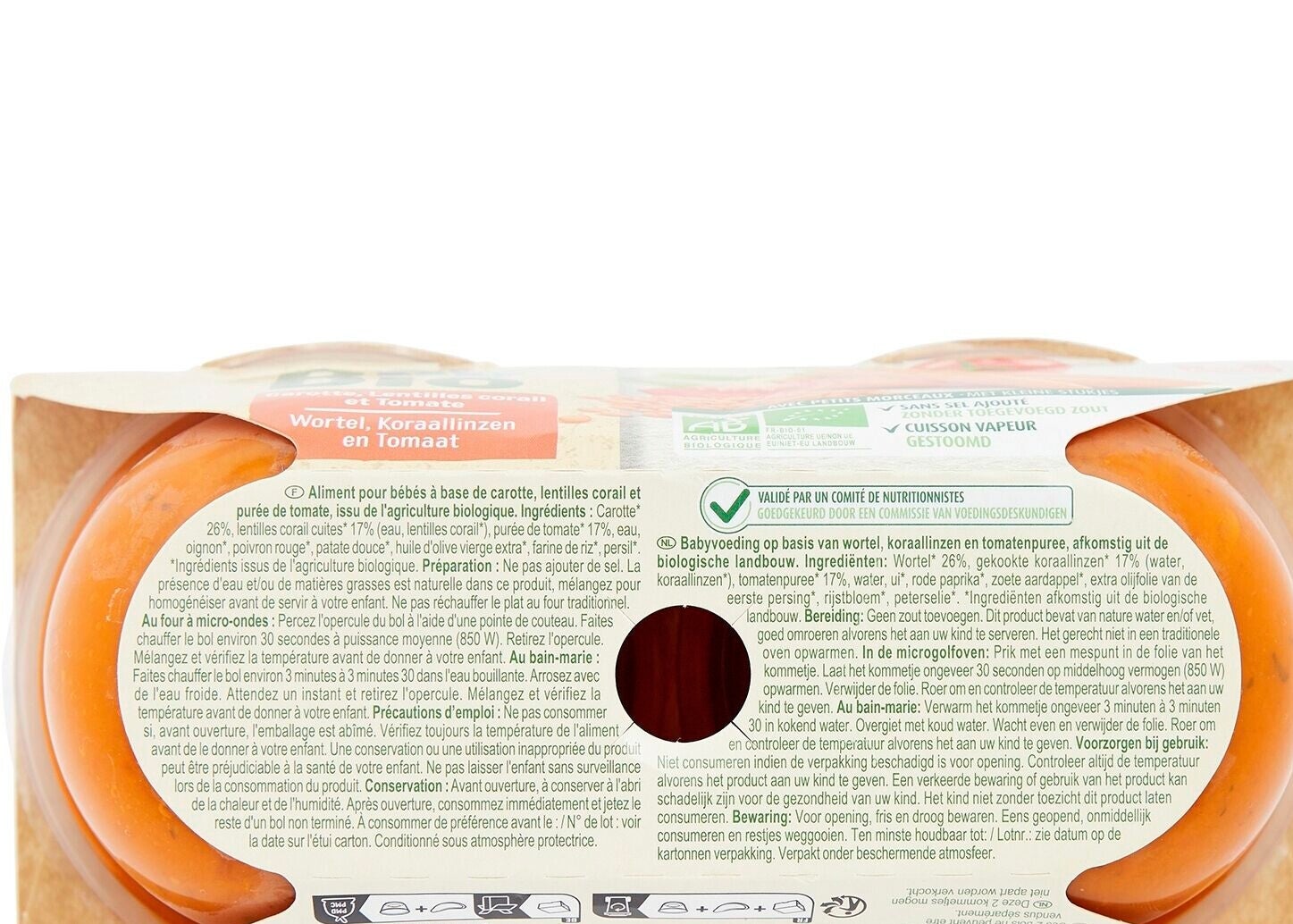 Bio-Babybrei mit Karotte und Linsen, geeignet ab 8 Monaten.