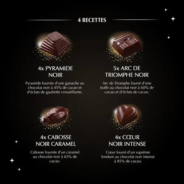 Die LINDT Champs-Élysées Noir Intense vereint 168 g feinste Zartbitter-Pralinen mit intensivem Kakaogeschmack. Eine elegante Auswahl dunkler Schokoladenkreationen, liebevoll gefertigt von den Maîtres Chocolatiers. Ideal als edles Geschenk oder für besondere Genussmomente.