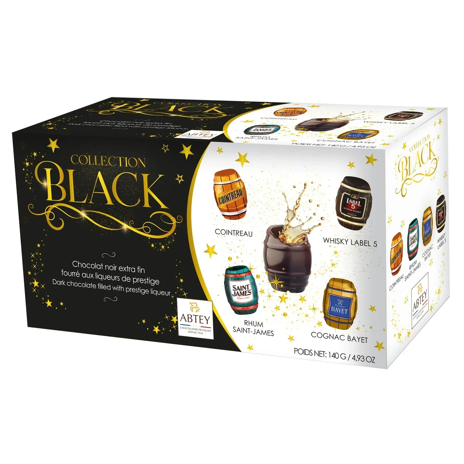 Die Black Collection von ABTEY bietet eine erlesene Auswahl feiner Zartbitterschokoladen mit flüssiger Likörfüllung.